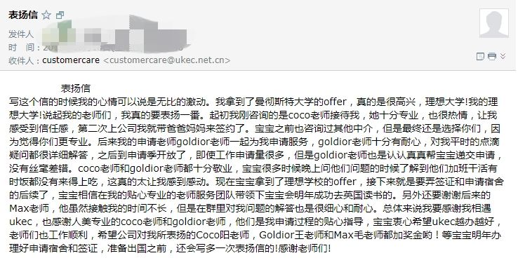M童鞋很早就有了去英国读硕的想法,外加学校是独立院校,于是早早就开始准备出国留学事宜。大二开始就跟家长一起走访了广州各大知名留学机构,不是很满意。直到来到了UKEC,才放心把自己的留学申请交给我们,一起努力赢得一个好结果。