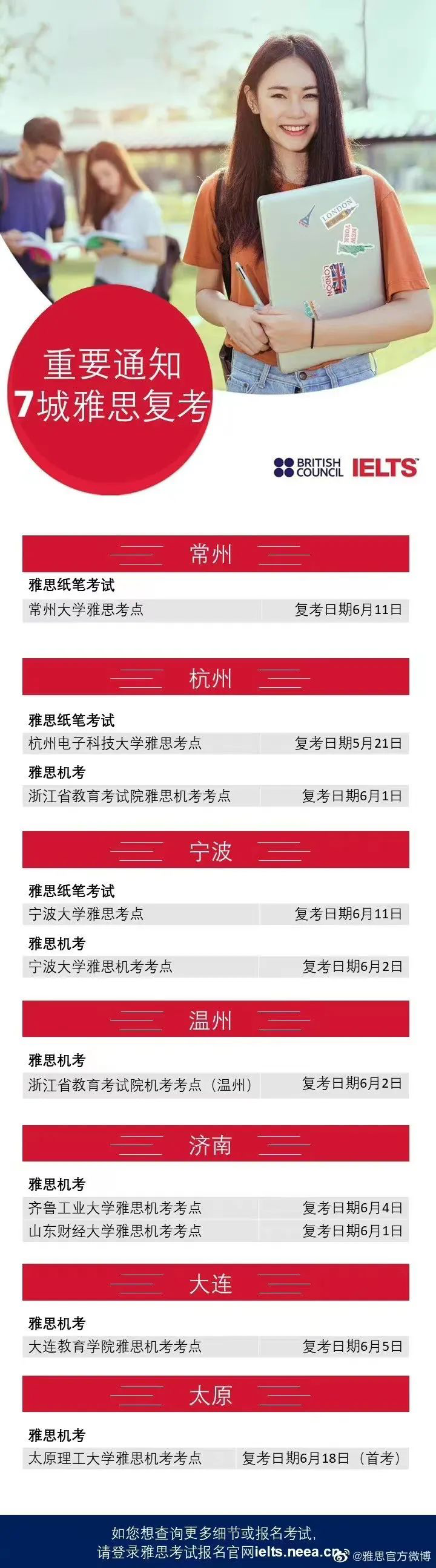 雅思官方微博宣布,在即将到来的6月,七座城市将恢复雅思考试,分别为:常州、杭州、宁波、温州、济南、大连、太原。