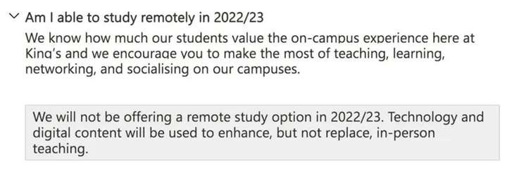 KCL官网信息表示,2022/23学年将恢复全面线下授课,并且不会提供远程学习选项。所有学生需要在2022年10月10日之前到校。