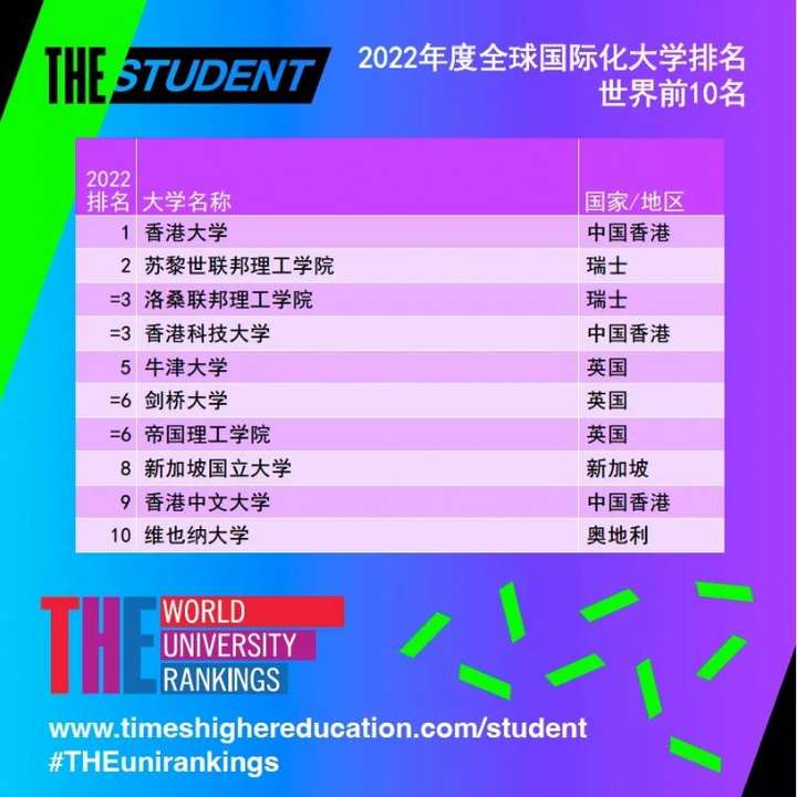 泰晤士高等教育2022年全球国际化大学榜单中的数据,主要来自于2022年泰晤士高等教育世界大学排名的“国际展望”评分。
