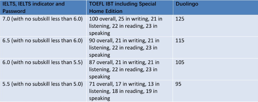 1, 正课和线上语言课程正式接受Duolingo, Password,TOFEL IBT Special Home Edition和IELTS indicator。正课的具体标准见官网。