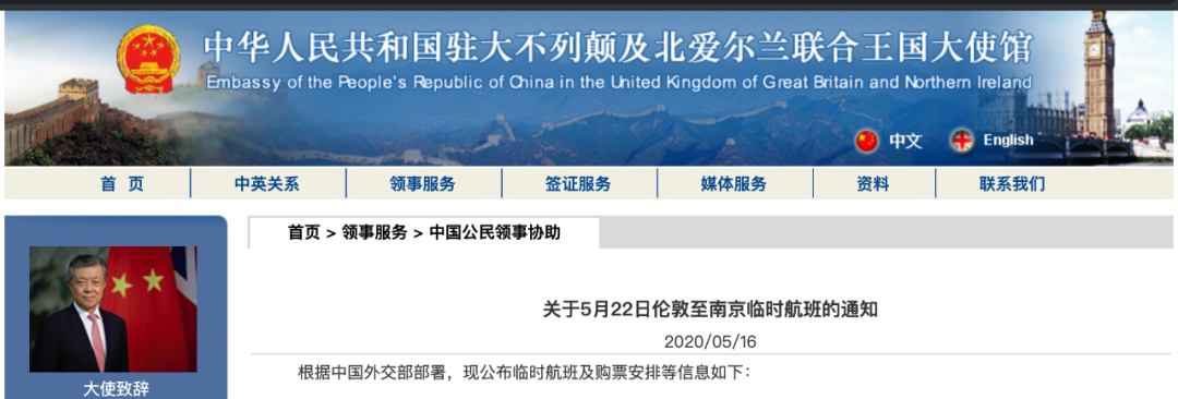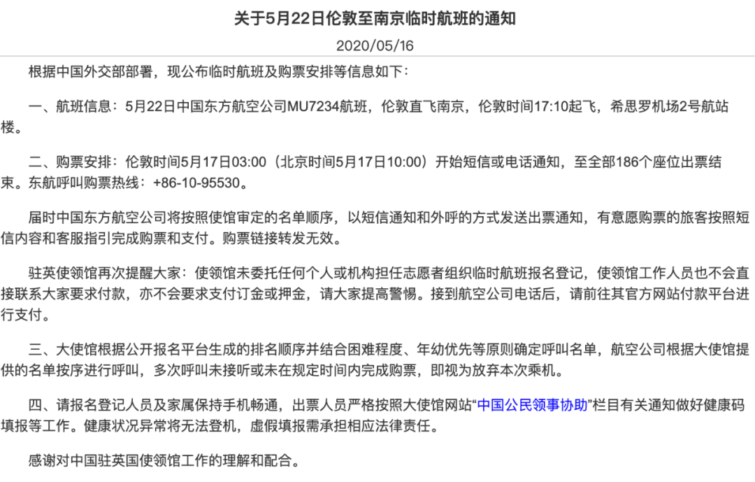 中国驻英大使馆为了继续协助在英处境困难留学人员搭乘临时航班回国,发布了《关于5月22日伦敦至南京临时航班的通知》。