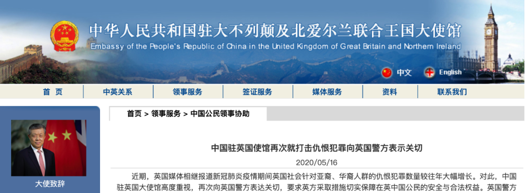 在一月至三月期间,针对中国人的仇恨犯罪记录增加,有受害者在街上被拳打,吐口水和咳嗽,相对比,针对中国人的仇视行为在警察局2019年仅为一宗,2018年也为一宗。对此,中国驻英大使馆在官网发布《中国驻英国使馆再次就打击仇恨犯罪向英国警方表示关切》。